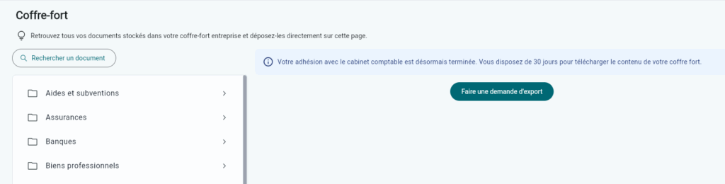 En cas de clôture d’un dossier ou de fin de mission, la date correspondante est définie par le collaborateur depuis Kinexo. L’adhérent est alors informé par mail de la fermeture de son coffre. À compter de cette date, l’ensemble des services sont désactivés. Toutefois, l’adhérent conserve un accès à son espace MyKinexo pendant 30 jours afin de pouvoir télécharger l’ensemble de ses documents depuis l’onglet « Coffre-fort ».